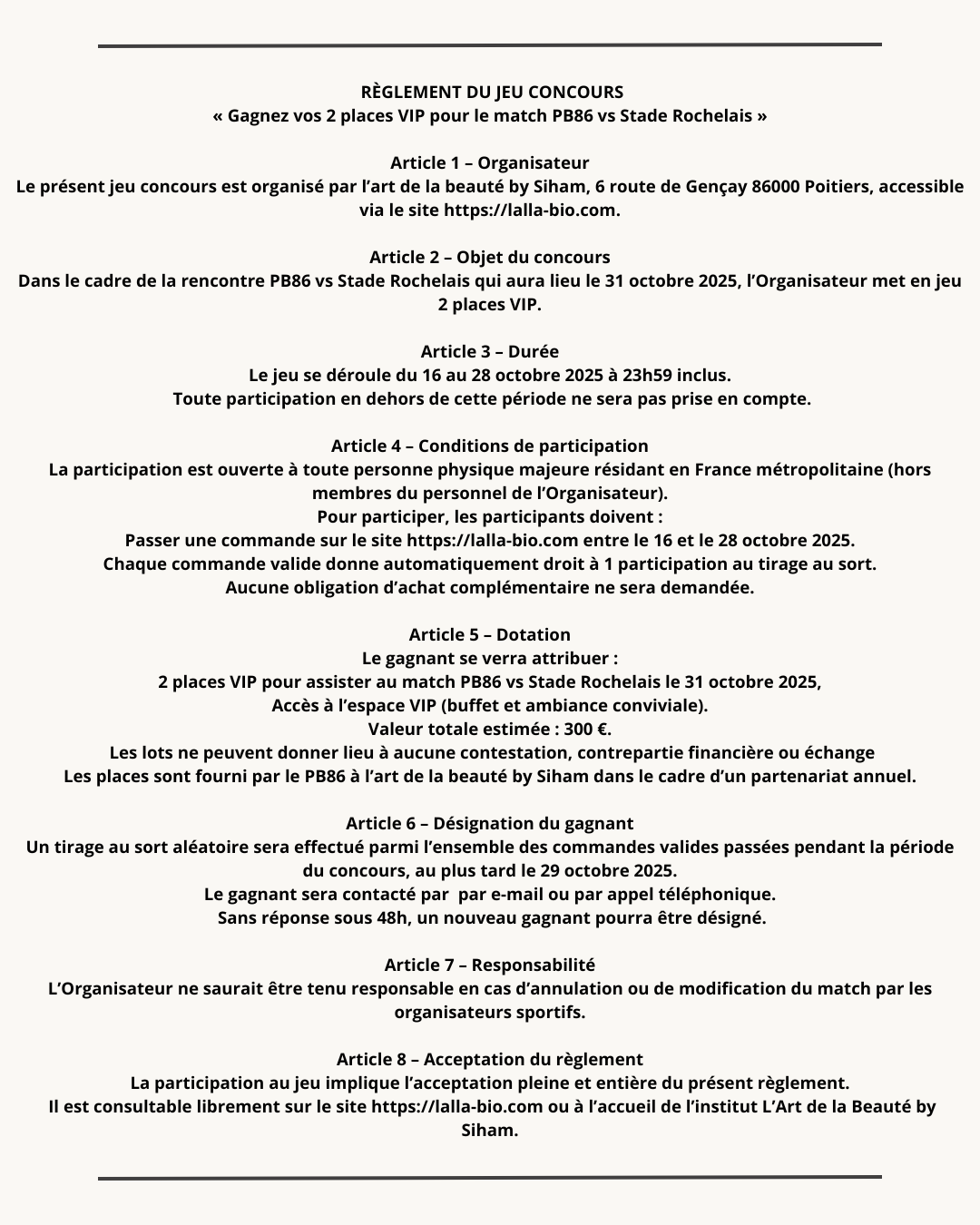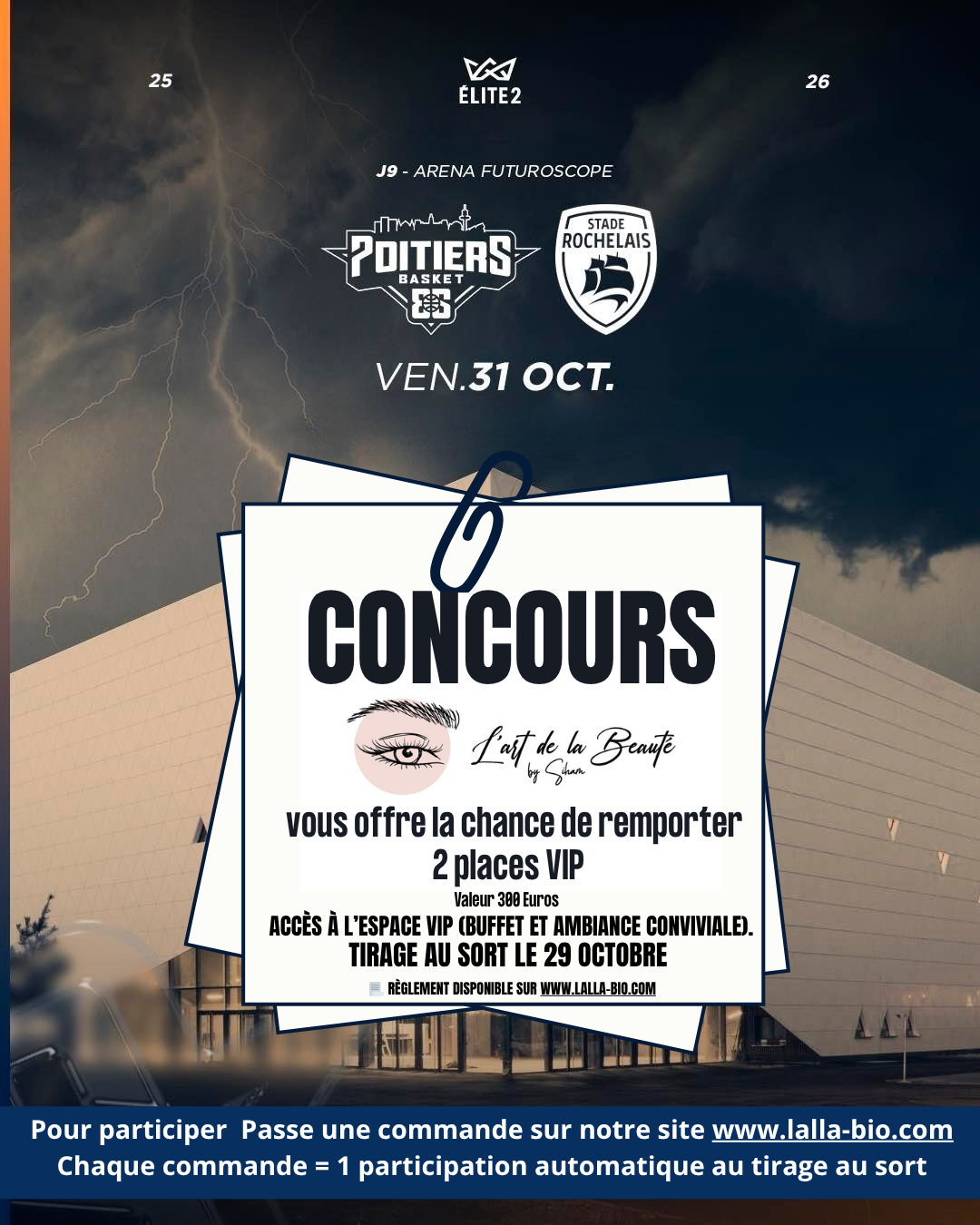 Mots-clĂ©s : jeu concours beautĂ©, Lalla Bio, places VIP Poitiers Basket, L’art de la beautĂ© by Siham, marque marocaine, soins naturels, cosmĂ©tiques, partenariat sportif.